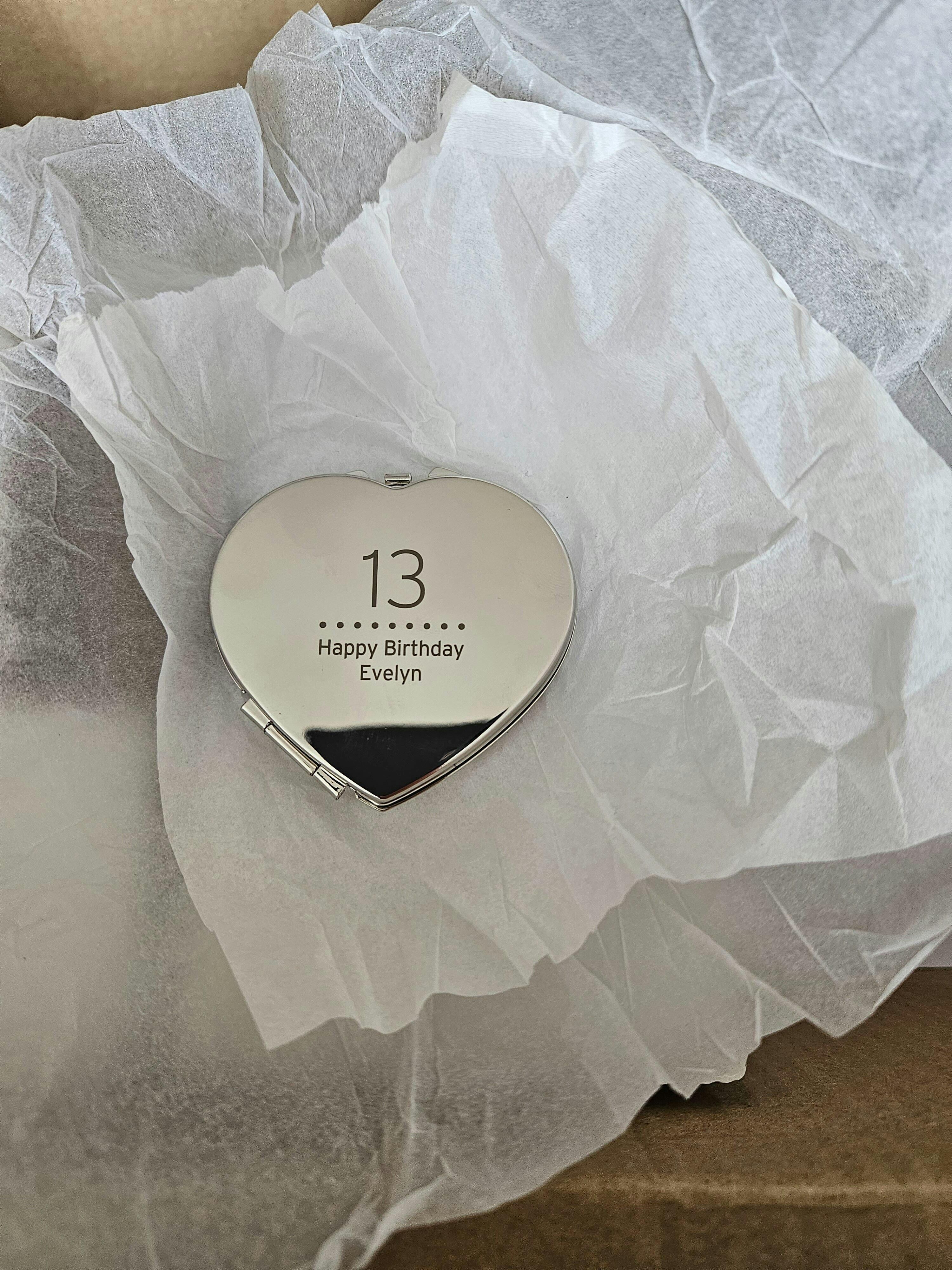 Personalise this compact mirror with an age up to 3 characters in length and a message over 2 lines of 25 characters per line.