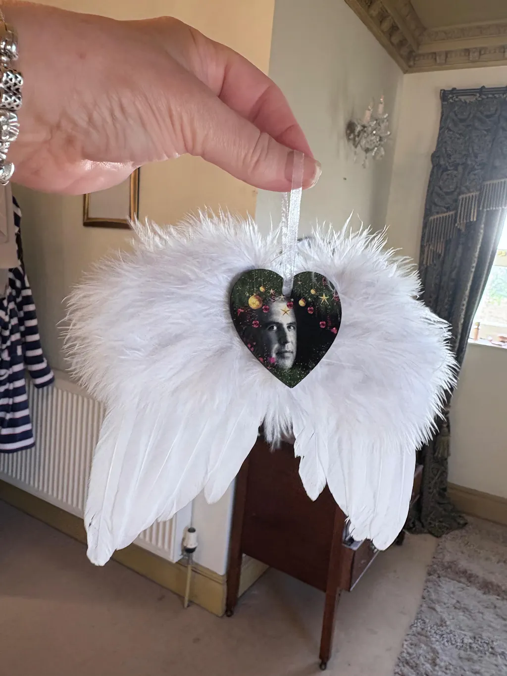Create a touching keepsake with our Hanging Angel Wing Decoration. Crafted with soft, white feathers, these angel wings feature a heart-shaped centre where we print your chosen photo, turning it into a beautiful memorial or sentimental ornament.